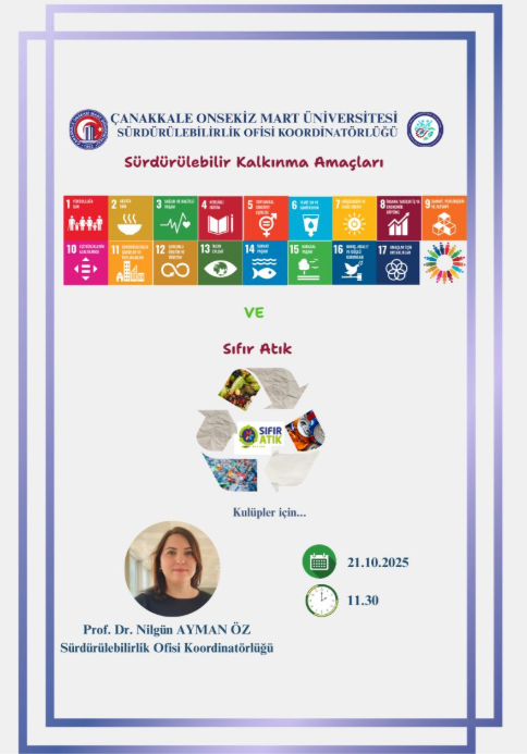 21 Ekim 2025 tarihinde Sürdürülebilirlik Ofisi Koordinatörümüz, Sıfır Atık Komisyonu üyesi Prof. Dr. Nilgün AYMAN ÖZ öğrenci kulüplerine yönelik Sürdürülebilir Kalkınma Amaçları ve Sıfır Atık konularında eğitim verdi. Üniversitemiz Birleşmiş Milletlerin 2030 Sürdürülebilir Kalkınma Amaçlarını (SKA) eğitim müfredatına, tezlere, projelere, öğrencilerimizin ve akademik personelimizin faaliyetlerine entegre edebilmesi amacıyla, bilgilendirme ve farkındalık çalışmalarına devam etmektedir. Ayrıca Üniversitemiz sıfır atık vizyonu doğrultusunda atık oluşumunun önlenmesi/azaltılması, atıkların yeniden kullanılması, ileri dönüşüm uygulamalarına öncelik vermektedir. Üniversitemizde elektronik cihazların güncellenerek ve mobilya atıklarının onarılarak tekrar kullanıma sunulması; takas şenlikleri ve sosyal medya paylaşım sitesi yardımı ile kullanılmayan giysi, kitap, mobilya vb. malzemelerin yeniden kullanılmak üzere paylaşılması; yemek menülerinin anketler yoluyla belirlenmesi ile organik atık oluşumunun azaltılması/engellenmesi gibi sıfır atık felsefesine ve atık yönetim hiyerarşisine uygun çalışmalar yapılmaktadır. Kulüplere gerek sıfır atık ve SKA’lar gerekse kulüp faaliyetleri sırasında atık yönetimine nasıl dikkat edebileceklerine dair bilgilendirme yapılmıştır.